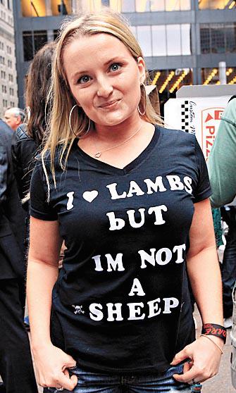 26歲的待業碩士畢業生Jennifer自製了一件文化衫前來聲援,她的T恤前面寫着「我愛羔羊但我們不是羊牯」,背面則寫上「人類需要的不是企業貪婪」。她解釋,他們不會接受大財團的洗腦,他們有自由意志。她批評美國大財團經常介入政治,利用捐獻左右政府施治及國會決定。這位26歲金髮姑娘已有一年找不到正職,目前只靠做保母維持生計,來自社工界的她,歸咎政府削減對志願機構的撥款,打爛了她的飯碗。