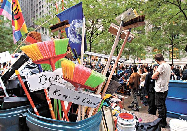 針對紐約市長彭博的指控,批評示威者把公園弄得一團糟,佔領者在公園一角設立了一個衞生部,找來大量清潔工具,掃帚、地拖、百潔布、水桶、清潔劑,目的就是要自律的維持公園潔淨,別讓政府有藉口清場。47歲的心理衞生工作者志願前來清潔公園,他說每天都要花上三小時動員最少十人做清潔。