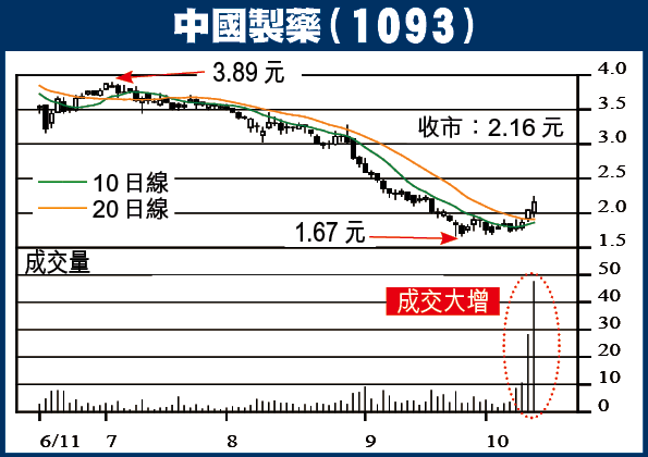 2)中國製藥(1093)上周連彈4日,成交大增,配合技術走勢轉強,短期彈勢持續,目標3.06元,博升41%。