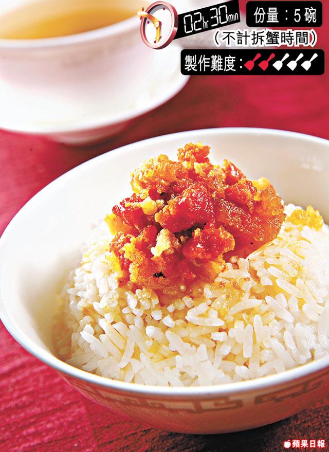 3.盛起蟹殼及薑葱,下蟹膏及蟹黃炒至乾身,放凉,放在飯面即成。