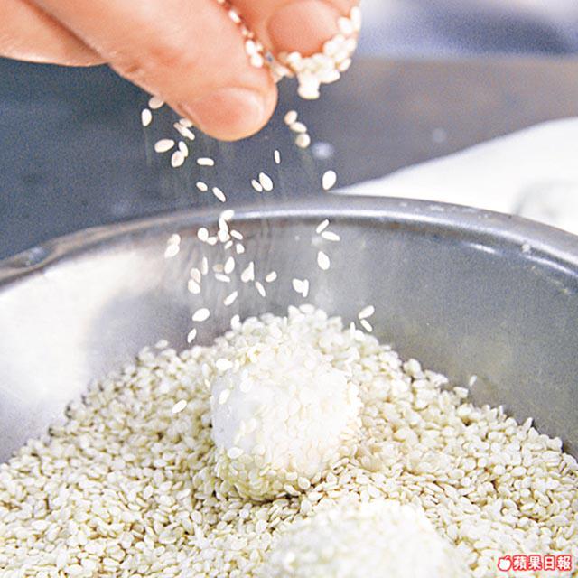 4.將適量餡料放在麪皮中包好,沾濕略搓,裹上芝麻成芝麻球。