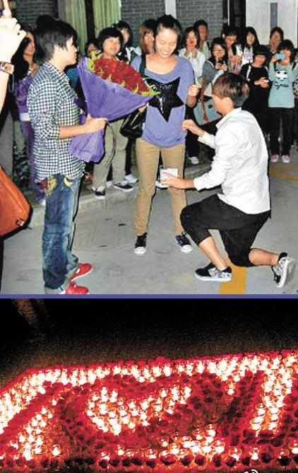在內地大學,男生在女生宿舍樓下大喊示愛已過時。上周六(8日)晚,在上海海洋大學一棟女生宿舍樓下出現女追女的一幕(圖),一名短髮女生用玫瑰花瓣砌出「ILoveU」字樣、圍上蠟燭,手捧大束玫瑰花,下跪向心儀的女同學示愛,吸引大批學生圍觀。對於這樣的一幕,學生、網民議論紛紛,很多人認為時代開放,同性公開示愛都沒甚麼大不了。新浪微博