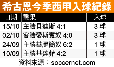 賓施馬受傷,基坦斯奴朗拿度(C朗)腳風欠順,皇馬最大得益者自然是希古恩;連續兩仗聯賽演帽子戲法,希古恩上周六不但助皇馬以4:1氣走貝迪斯,個人聯賽入球增至8球,力逼國家隊隊友美斯。