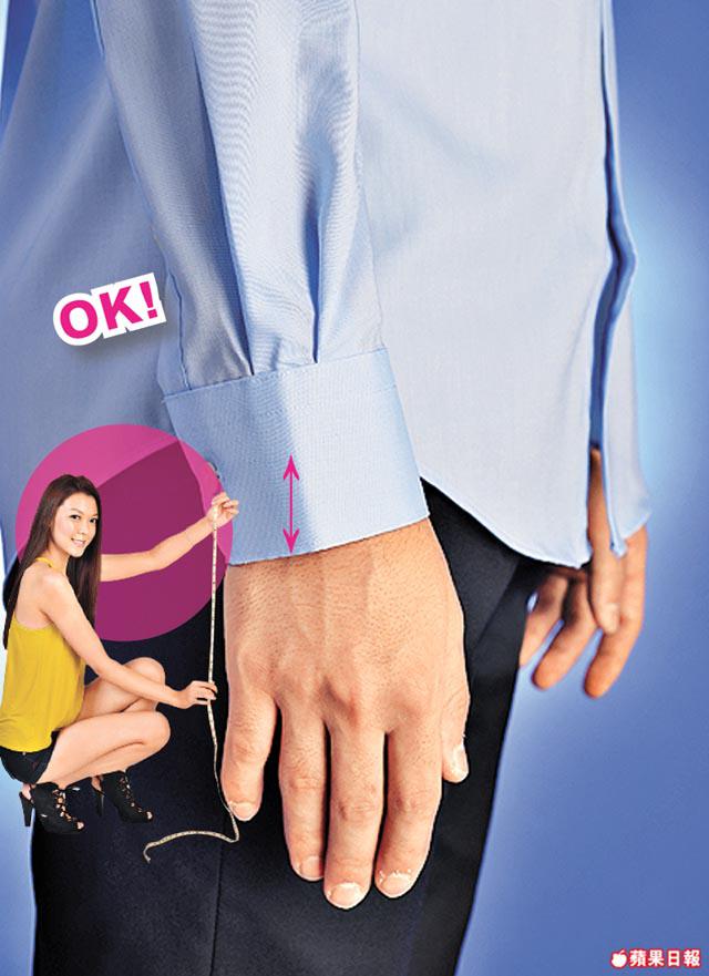 手臂自然下垂時,袖長要剛好至手腕對下半吋位置!另外,還要注意袖口寬度,太緊的話袖口不能自然垂下,「卡」在手腕處就會顯得袖過短。而習慣戴錶的人亦應預留空間。
