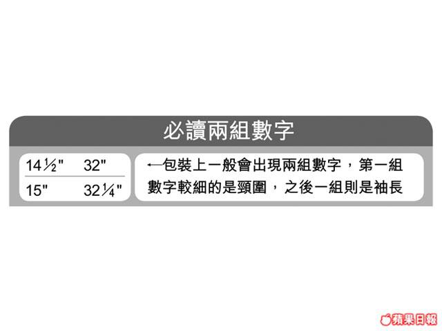 一般來說,恤衫均以頸圍及袖長來細分尺碼,通常每半吋升一個碼,袖長變化不太明顯,每大一個碼約長1/4至1/2吋不等,尺碼比例視乎品牌而定,最好親身去試,否則在W.W.Chan&SonTailor(23669738)訂做一件也不過$1,300!