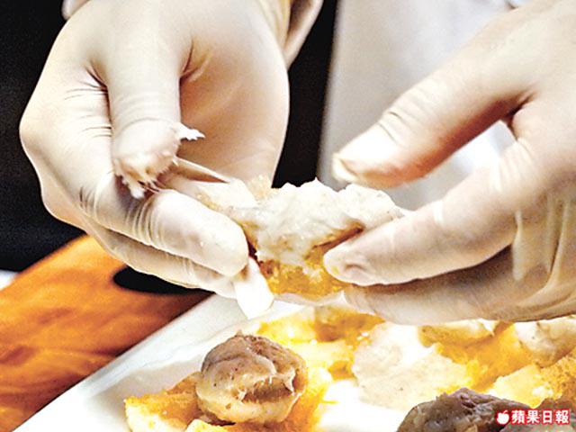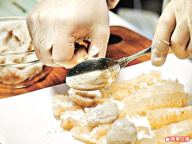 2.將蝦膠唧成丸狀,放上鱔肚,用手輕輕抹平蝦膠。