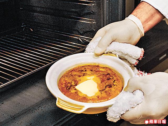 2.拂打另一隻雞蛋,倒入已蒸好的蟹粉蛋上,放入預熱至200℃焗爐,焗15分鐘。