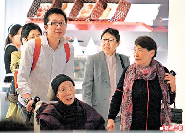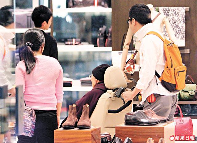 前晚7時半,記者在ifc一餐廳旁見到坐在福祉車上的六叔,六叔戴上冷帽、披上大披肩,身旁還有一菲傭陪伴,其間菲傭怕六叔冷親,一度為他整理披肩。原來,六嬸偕另一菲傭到附近的laprairie護膚品店買護膚品,估計為怕悶親六叔,所以未有與他同行,着他在附近等候。