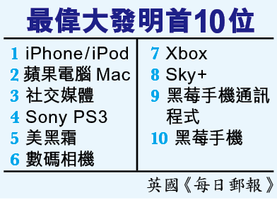 英國少年,看偉大發明,幾乎都是科技發明,當中蘋果iPhone和iPad(圖)是王者,蘋果Mac機排第二,社交網站facebook和twitter第三,SonyPS3遊戲機第四,排第五的有點異類──居然是美黑霜。