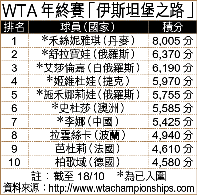 【綜合土耳其外電】WTA年終賽今年於土耳其伊斯坦堡舉行,排名前8球手將獲參賽資格,賽事下周二展開。如今已有7個席位鎖定,包括禾絲妮雅琪、舒拉寶娃、姬維杜娃及艾莎倫嘉等(見附表);李娜亦已確定獲得參賽資格,成為首個出戰年終賽的中國球手。