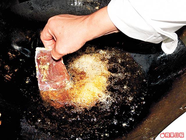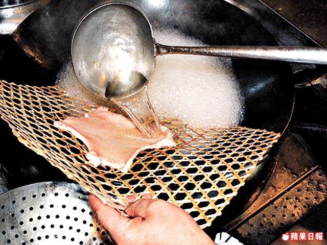 4.燒滾油,不斷淋油在鴨皮上,炸至金黃色,瀝油後平均地切片,備用。