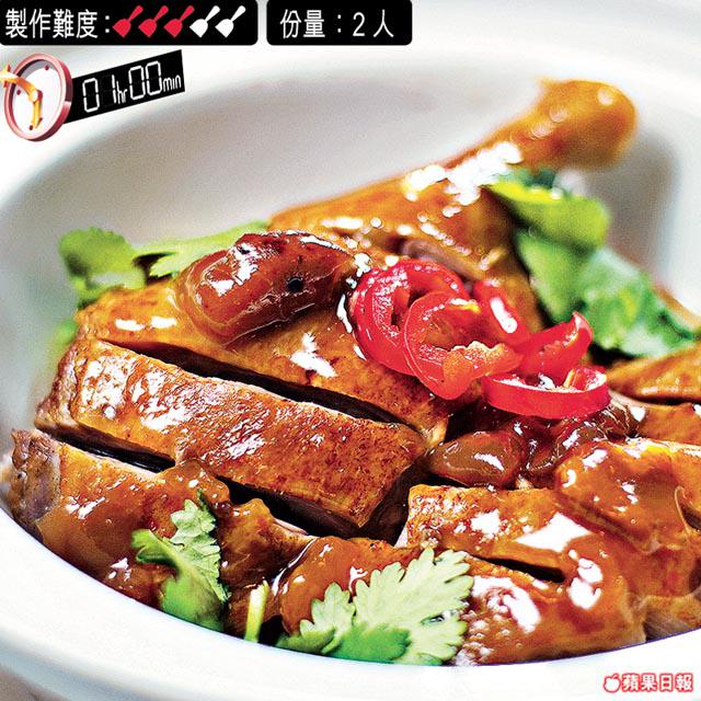 2.燒熱鑊下雞湯、鹽、糖、胡椒粉、鴨髀略煮,盛起,以大火蒸30分鐘至軟腍,斬件,備用。