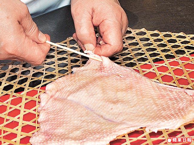 1.鴨胸起皮,鴨胸下香草醬、鹽、糖、雞粉醃半小時,備用。鴨皮用竹籤穿在竹格上,備用。
