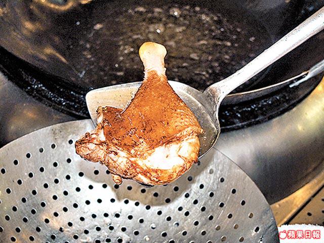 1.鴨髀下老抽抹勻,燒滾油,下鴨髀炸至金黃色,盛起。
