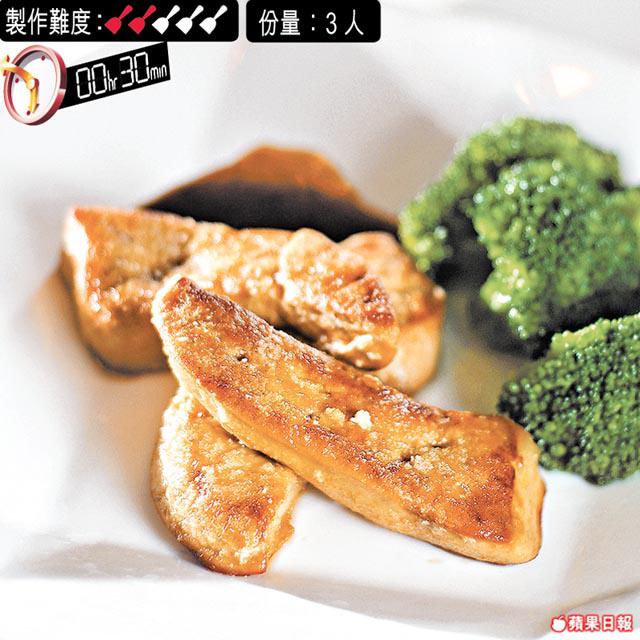 3.鴨肝拍上生粉,下油鑊煎至兩邊金黃色,約八成熟,上碟,淋上醬汁,放上西蘭花作伴碟即可。