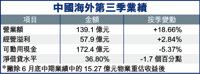 【本報訊】雖然內地樓市表現欠佳,但龍頭中國海外(688)仍錄得強勁業績,公司昨公佈第三季營運數據,經營溢利按季減少19.1%至57.9億元,但若撇除6月底公司約有15.27億元物業重估入賬,則錄得近3%增長,符合市場預期。但中海對市況看法轉趨審慎,預計調控政策將延伸至明年。 記者:張活儀