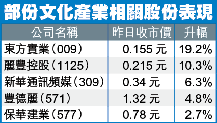 文化產業自04年在國務院相關的研究獲確立分類後,首度被提升至前所未有的領導產業地位。相關股份昨日表現亮麗,其中從事電影製作相關業務及電影菲林沖印的東方實業(009),股價一度升逾兩成,收市仍升19.2%,報0.155元;至於剛於上月公佈與麗豐(1125)共同發展珠海「星藝文創天地」的豐德麗(571),兩者股價昨日爆升,麗豐升10.3%,收報0.215元;豐德麗亦升4.8%,收報1.32元。