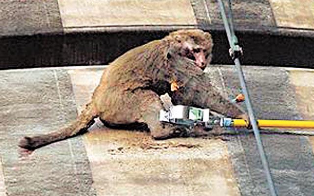 台灣一隻潑猴(圖)大鬧高鐵站期間誤觸高壓電線,隨即被電致全身抽搐。高鐵左營站周日(16日)出現一名囂張的不速之客,一隻猴子在車站高處晃了三小時,現場消防員全無辦法。但在牠準備跳到軌道上列車時,卻誤觸高壓電線,頓時火花四射並發出巨大爆炸聲,牠遭電擊至全身抽搐,皮毛被炸焦還冒白煙,受傷暈倒。後來牠突然醒翻來,像喝醉酒般搖頭晃腦,以雙手撐地坐在列車頂。相關人員趕緊射麻醉槍,令牠失去知覺後抓捕。台灣《蘋果日報》