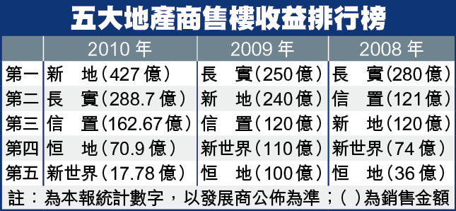 翻查資料,按售樓收益計新世界於過去3年雖仍在「五大」之列,但其中一次「包尾」,兩次「梗頸四」,舊年還創下近年新低,全年售樓收益只有約17.78億元,與對上一位的恒地(012)相差約53.12億元,同榜首的新地(016)更相差逾409億元。