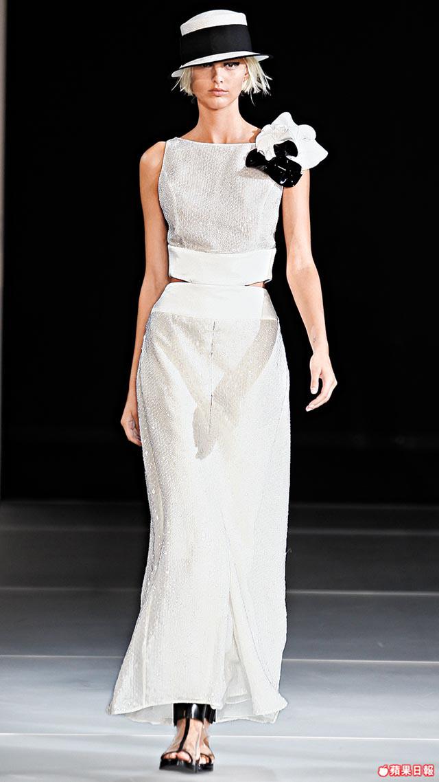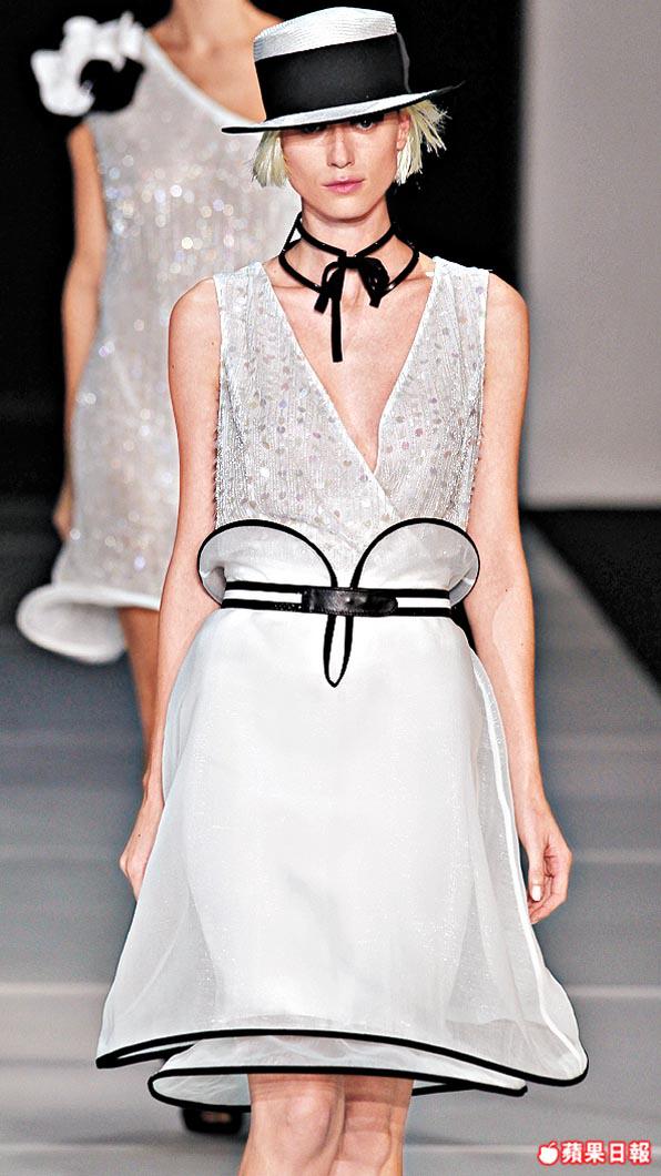 明年春夏沒有大紅大紫的刺眼顏色,大師沉醉於黑白monotone的世界,之外有優雅的湖水綠、天藍色和淡彩粉紅,另採用嶄新物料,令晚裝裙造出如珍珠般glittering的閃亮效果,低調而華麗。