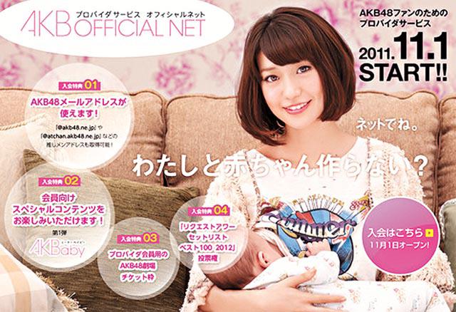 宅男女神組合AKB48,近日開設全新網站AKBOFFICIALNET,第一個遊戲就充滿誘惑,只要粉絲加入成為會員,就可以選擇喜愛的成員與自己的照片炮製合成BB照。身為組合第二把交椅的大島優子負責宣傳該遊戲,她在廣告中竟說:「想與我製造BB嗎?」已經迷暈所有宅男,她更在其中一張廣告照中扮餵人奶!