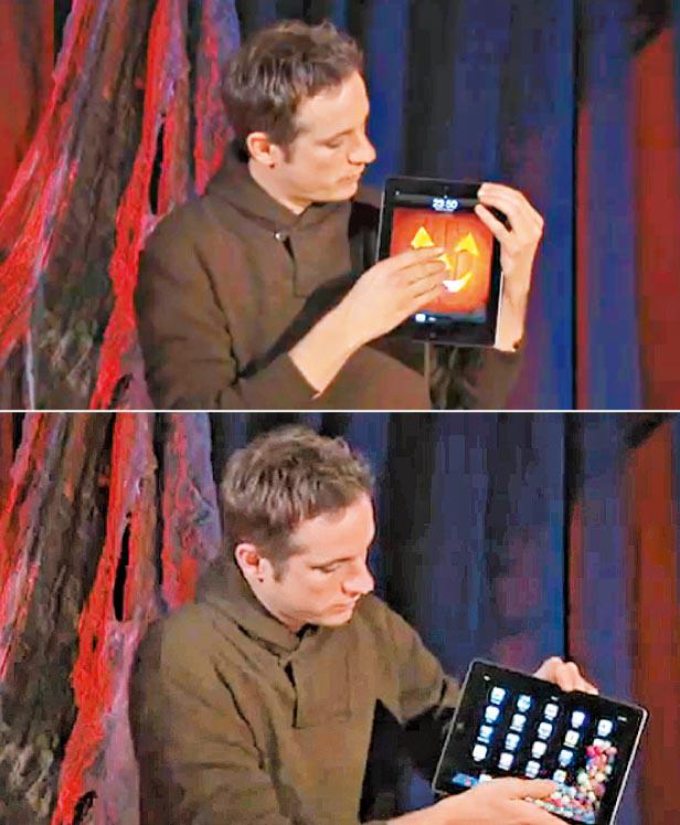 皮埃羅徒手從蠟燭取火,在iPad輕輕一吹,屏幕上就亮出南瓜燈籠(上圖)。當他說到萬聖節不只是「不給糖果就搗蛋」(tricksortreats)時,iPad倒出大量糖果(下圖)。真正的驚嚇故事開始:從前,有一個小丑在某年10月殺了一名女子,自此每年都回來找獵物……驚嚇度未夠,他就iPad抹出鮮血、拿出小丑鼻和搖落樹葉,最後更以iPad「變臉」,成為那殺人的小丑。