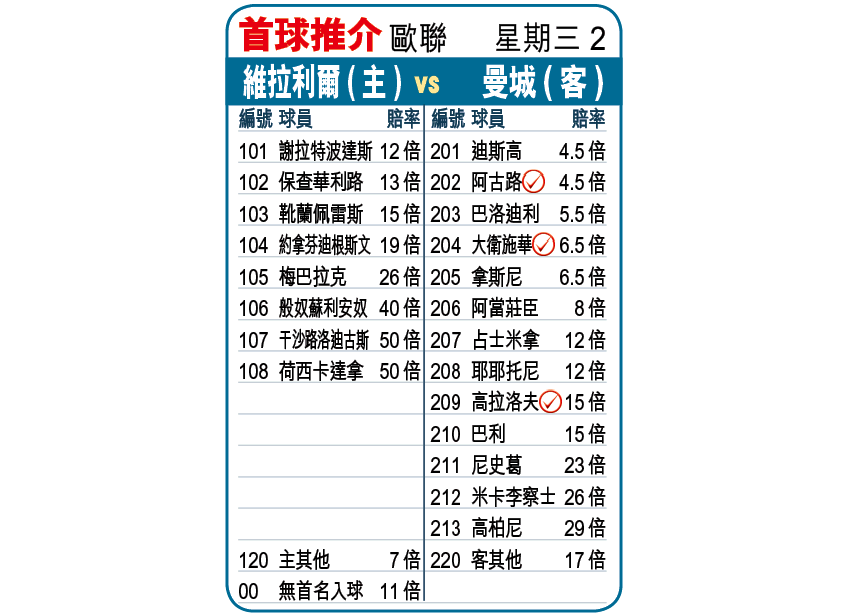 周三歐聯A組分組賽,維拉利爾迎曼城一戰隨時是場大屠殺,黃潛艇傷兵問題極極極嚴重,曼城又欲振聲威,故要捧「客勝」,再捧「客其他」。(球賽編號:星期三2;有線61及201台明日3:45am直播)守丹