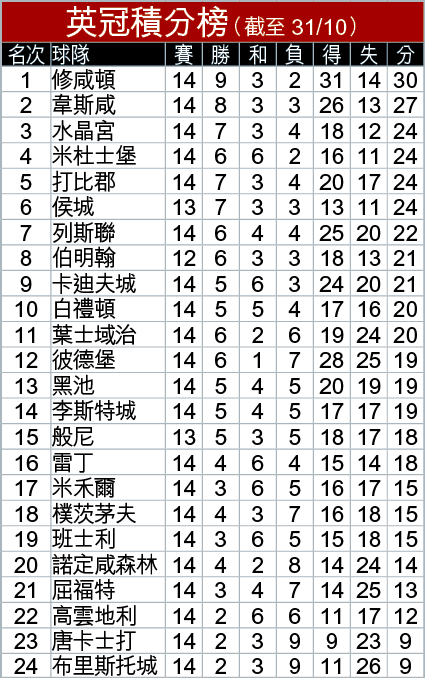 修咸頓以英甲亞軍的身份升班,但升上英冠後表現較英甲冠軍的白禮頓還好,目前以14戰得30分在榜首領導群雄,在周二迎戰另一支升班馬彼德堡時,料有老將前鋒干洛尼復任正選,夥拍腳風甚順的列基林拔攻堅;加上彼德堡又續有中前場球員李爾湯連被罰停賽,修咸頓勝望壓一。