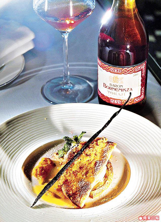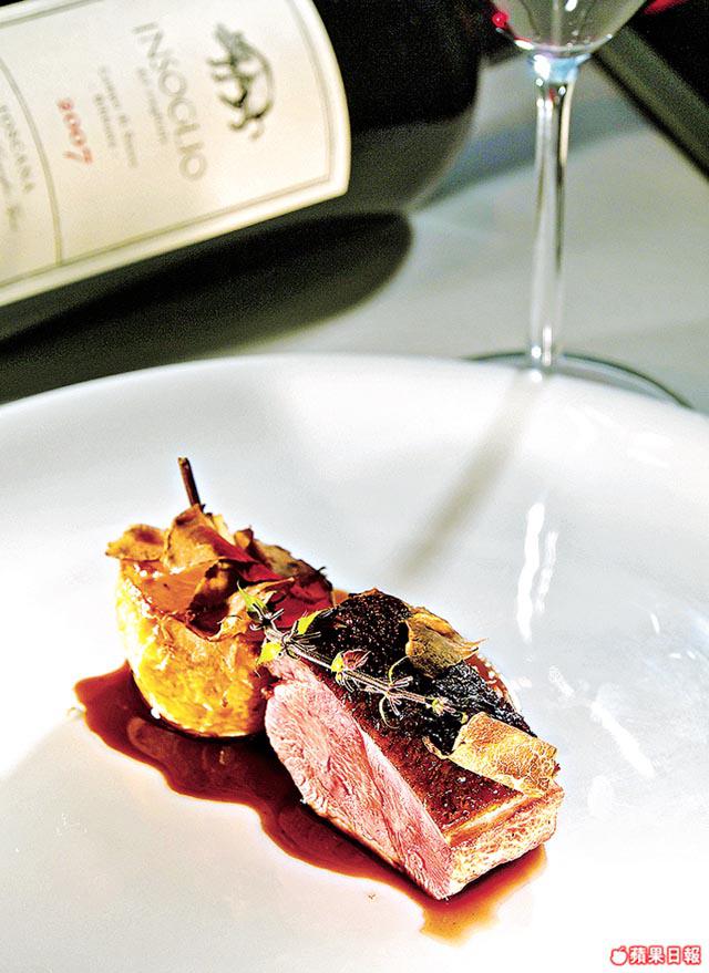 再來是一鴨兩吃,用鴨的不同部份做出兩道菜式,先來香辣鴨腿酥,酥皮包着鴨腿肉、雞肉、黑松露、乾葱和法國風乾煙肉,醬汁則用鴨骨熬成,灑辣椒粉份外惹味,Creash:「評分達92分的IlPinodiBiserno2007,結構Talent有餘韻,能提升肉香中和鴨腿油膩感。」矜貴鴨胸,則用低溫處理,伴碟的法國薯仔用橄欖油焗好,最後淋鴨骨汁和撒白松露片,「Biserno2007同樣有92分評分,很Smooth,相比鴨腿,鴨胸油份不算多,配這支酒剛剛好。」甜品忌廉蘋果批,英文名字很有趣,叫「UpsideDown」,「傳統做法,焗完酥皮會反轉上桌,以免出倒汗水令酥皮變腍,所以叫『UpsideDown』,中間夾自製忌廉,味道極濃郁。」宜配喝匈牙利BaronBornemiszaTokaji6Puttonyos2000,既可突出蘋果的甜,也可平衡酒本身的酸,兩者在口腔結合,非常和諧。