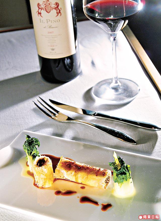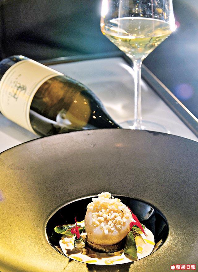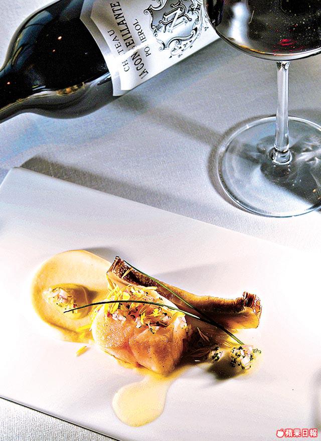 有美酒,當然要配佳餚,在11月16日舉行的「ItalianWineDinner」,吃的當然不是一般薄餅意粉,六道菜各配意大利TenutadiBiserno或新西蘭CampodiSasso這兩酒莊的出品,經理Creash:「菜式醬汁甚至本身煮法,都會影響到緊隨入口的酒味,所以事前我先試酒,再與總廚BjoernPanek討論菜式。」頭盤有芥末柚子暖三文魚,法國三文魚用香草和橄欖油浸一日,略煎四邊加柚子肉,最後配用醋、蒜、蛋黃醬、芥末製成的醬汁,為賣相美觀,再放法國食用花和西班牙辣椒粉,味道酸甜醒胃。Creash:「吃這道菜,宜配喝新西蘭MountNelsonSauvignonBlanc2009,菜式既用芥末吊起味道,頭盤的酒就要夠清新,這酒有喚醒味蕾之效,味道不會太複雜,最重要是醒胃。」