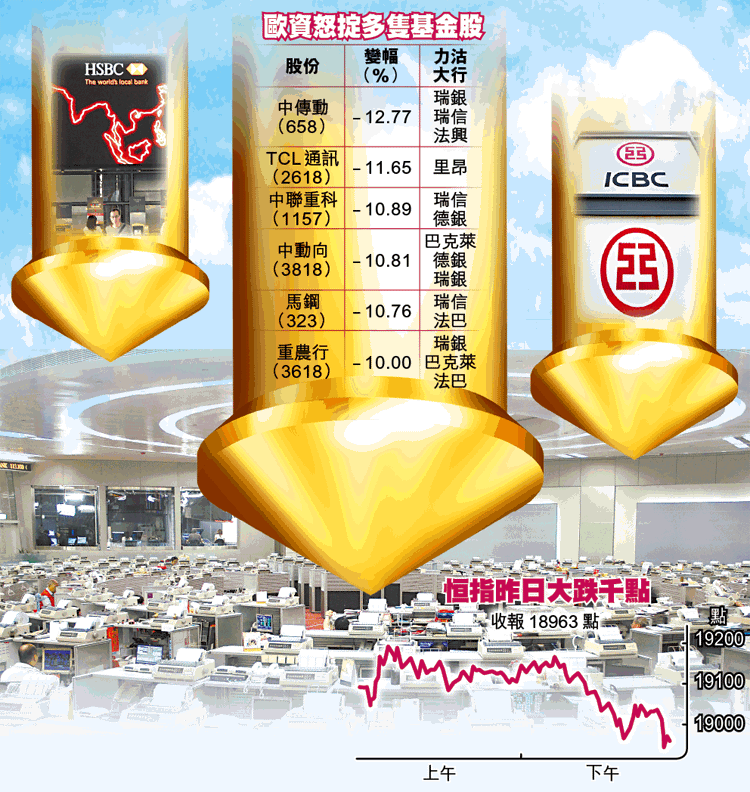 【本報訊】歐資大行齊沽貨散水!意大利債息飆升,觸發歐債危機再度升溫,全球出現骨牌式股災,港股昨日再現恐慌性拋售,恒指埋單大瀉1050點(5.25%),收18963點,是8月9日以來最大單日跌幅,主板成交747億元,日內連失兩萬、萬九兩大心理關口。沽盤當中,以歐資行沽得最狠,由藍籌至二三線基金股,盡現其出貨手影,擺明以實際行動對後市投不信任票。記者:李嘉麟