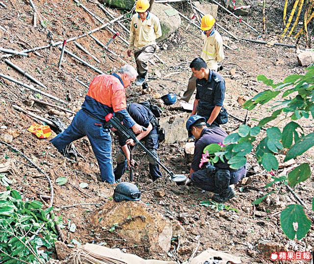 昨晨10時許,手持金屬探測器的澳洲專家確定山坡多個位置有炸彈後,召警方爆炸品處理課人員到場檢查,掘出七枚英式炮彈,其中六枚為空心彈殼,直徑3吋、長1呎,另一枚直徑6吋、長呎半的炮彈內有炸藥,移走有危險。工人在附近挖掘一個約1米深大坑,再用沙包將炮彈團團圍住,又封鎖東區走廊來回線。
