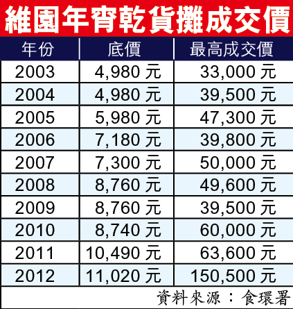 【本報訊】維園年宵繼前日創出熟食檔近10年最高的51萬元成交價後,乾貨攤位昨再破紀錄。位處銅鑼灣糖街入口的60號單邊攤檔,去年已創下6.36萬元新高,今年同一攤檔引來三雄相爭,經歷約40分鐘、200多口激烈承價,終由一個「神秘女子團」,擊退了「雞仔餅大王」,以15.05萬元奪得,較去年高出逾一倍。