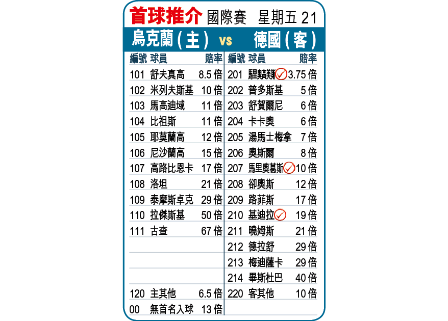 另一支擺明試陣的則是德國,後者訪烏克蘭時(球賽編號:星期五21;無綫翡翠台明日3:45am直播),教練路維表明會試新人新陣;不過,由於德國近年新人不斷湧現,而前鋒馬里奧高美斯亦「弗」,訪有一對老將前鋒舒夫真高與禾路連回春的烏克蘭,可望開入球「大」。