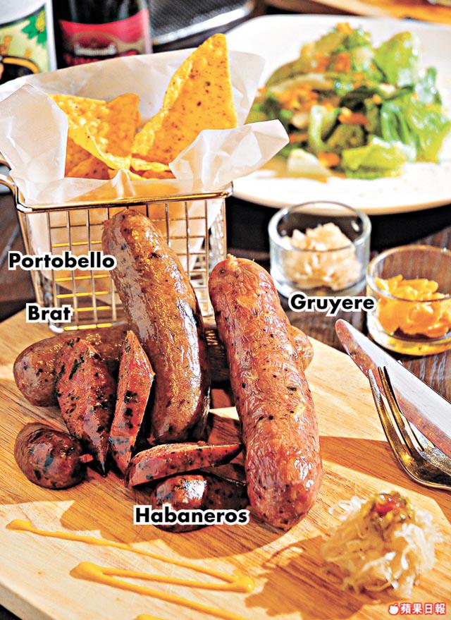 狹小空間,瀰漫烤肉腸香氣,嗜肉兼多心的你必點叫肉腸拼盤套餐,可自選四款肉腸、兩款芥末醬汁、兩款配料及薯片,Jancy選擇了Brat、Habaneros、Portobello及Gruyere四款經典肉腸,「Brat味道清淡少少,吃的是肉香;Habaneros是香辣之選,挑戰你味蕾。」Portobello及Gruyere最有看頭,前者是蘑菇雞肉腸,味濃Portobello蘑菇用香草調味,配清淡雞肉,一濃一淡味道很夾;後者則是雞肉芝士腸,輕輕切開竟有芝士汁流出,濃濃香味源自瑞士Gruyere及Emmental芝士,吃過這腸,火鍋常吃那雪到硬邦邦的肥短芝士腸,從此再無機會進入我嘴巴。
