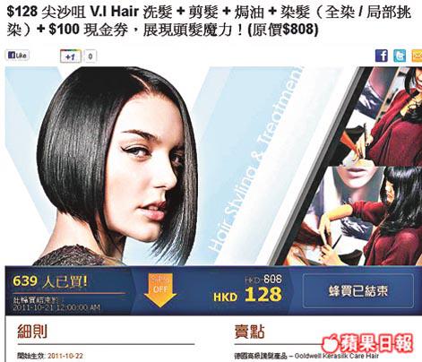 【本報訊】已有近900人購買了團購券的V.I.HAIR髮型屋被消費者指摘劏客,以筍價引君入甕,付款時「任佢噏」。有網民持128元包洗剪染團購券,被要求支付附加費;另有街客光顧基本洗剪恤應付99元,付款時卻被索取兩倍費用。消委會發言人表示,團購投訴由去年2宗急升至今年逾250宗,不少商戶以平價及團購招客,細則不清晰容易引起爭拗,消費者購買前宜直接向商戶了解。