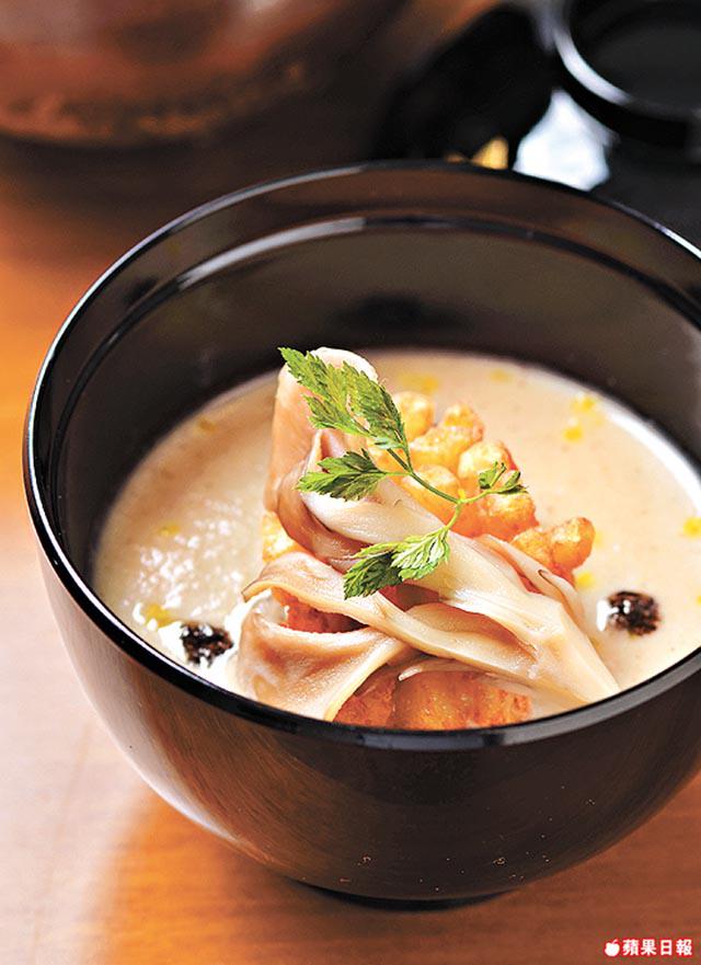 味蕾蘇醒,是時候喝碗和風野菌帆立貝濃湯暖暖肚,木魚花湯底飄出菇菌洋葱香,上放炸過的北海道帶子,配時令舞茸菇,比一般湯水濃,海鮮味十足。