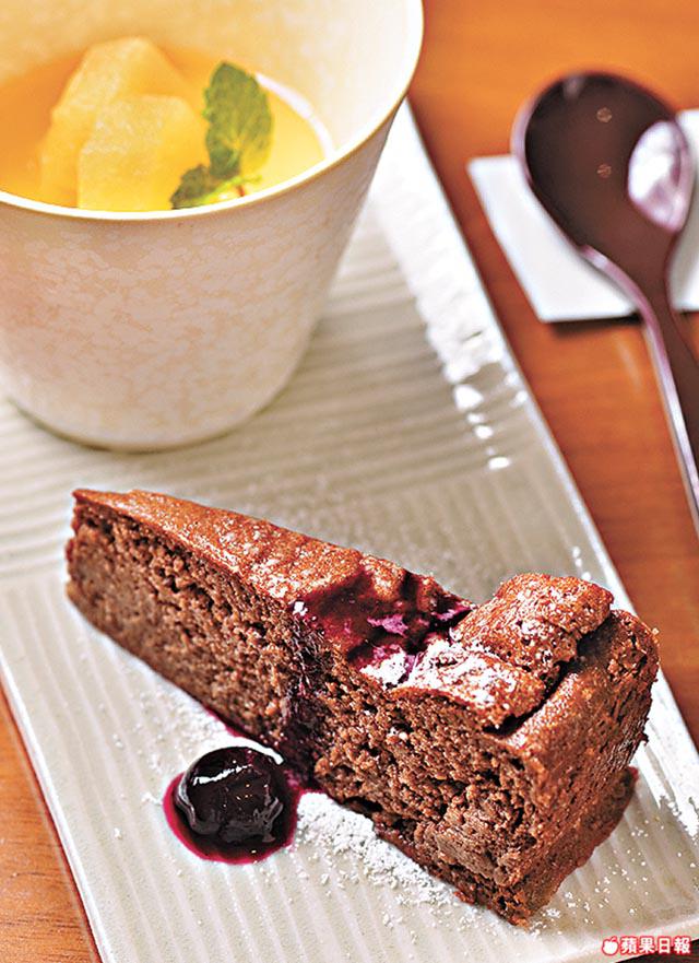食事二選一,想有熱辣辣米氣落肚,那就不能錯過鯛魚石鍋飯,米非普通米,而是經過加工的優質米,「日本米運來後,我們會交到香港唯一精米所『俵屋玄兵衞』進行精米程序,磨製成『一見鍾情米』,上鋪鯛魚肉和菇菌,講究地用豉油混木魚花湯做煲米水,器皿也是精米所推介的傳統日本土鍋。」一打開木蓋,煙氣縷縷升起,魚香和米飯香……怎形容好呢,那是種能即時惹起人食慾的香,魚肉夠鮮,米粒軟硬適中,煙韌軟綿。甜品方面,有自製蘋果慕絲和朱古力蛋糕,慕絲用日本紅蘋果製,蛋糕則配藍莓紅酒汁,兩者同樣酸中帶甜,絲毫不覺甜膩。