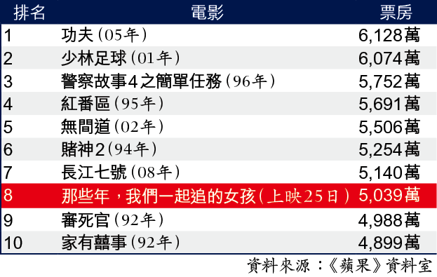 《那些年》後勁依然凌厲,截至前日,在港上映了25天票房已衝破5,000萬大關,將原本在歷年十大華語電影票房榜排第十、收4,875萬的《色,戒》打出十大之外,看來挑戰《功夫》的6,128萬票房不是夢。