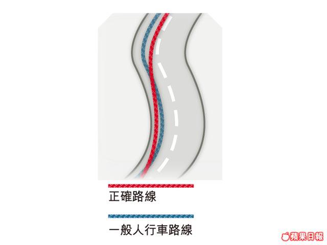 入彎時行正路並非指行馬路正中間,因為路中間油漬多垃圾多,電單車手應該盡量避開。經常提到的DefenceRiding就是入彎路線要正確(圖示),讓對頭車容易睇到你之餘,又可縮短行車距離、減低車身傾斜時間,更加可令出彎角度盡量放大睇清路面情況。