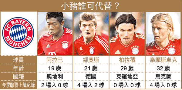 簡評:「小豬」舒韋恩史迪加受傷,拜仁痛失中場樞紐,但球隊中場勝在兵源充足,新人有阿拉巴及卻奧斯。如果要經驗老將,柏拉積及泰摩斯卓克都可候命。奧地利的阿拉巴是拜仁重點培訓的對象,今季德甲2次正選及9次後備,而歐聯亦有2次後備上陣,相信今仗有望趁「小豬」缺陣而上位。