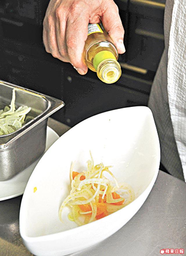 精通南北意大利菜的Patrizio示範的這道頭盤,充滿南意風情。味道清淡的煙劍魚配上檸檬油做成的汁料,清新健康。