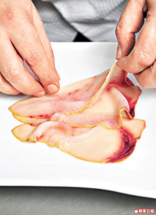 1. 煙劍魚切成3塊約5毫米厚的魚片,排在碟上。