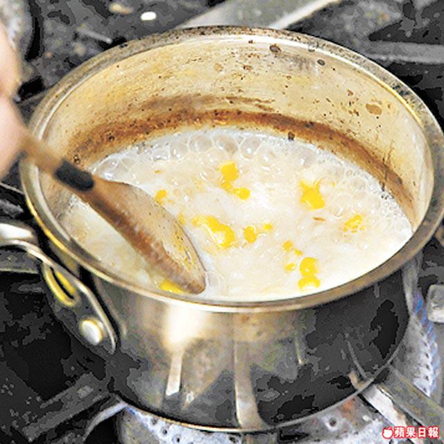 3.將忌廉湯底、熟粟米、半份牛油粒放入攪拌機中,打成幼滑粟米忌廉醬。