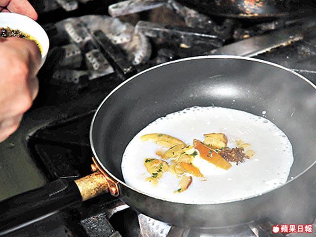 2.鑊中加油,下乾葱茸同炒,收細火,下白酒煮約10分鐘,加入半份雞湯再煮10分鐘,再放忌廉10分鐘成忌廉湯底,待凉備用。