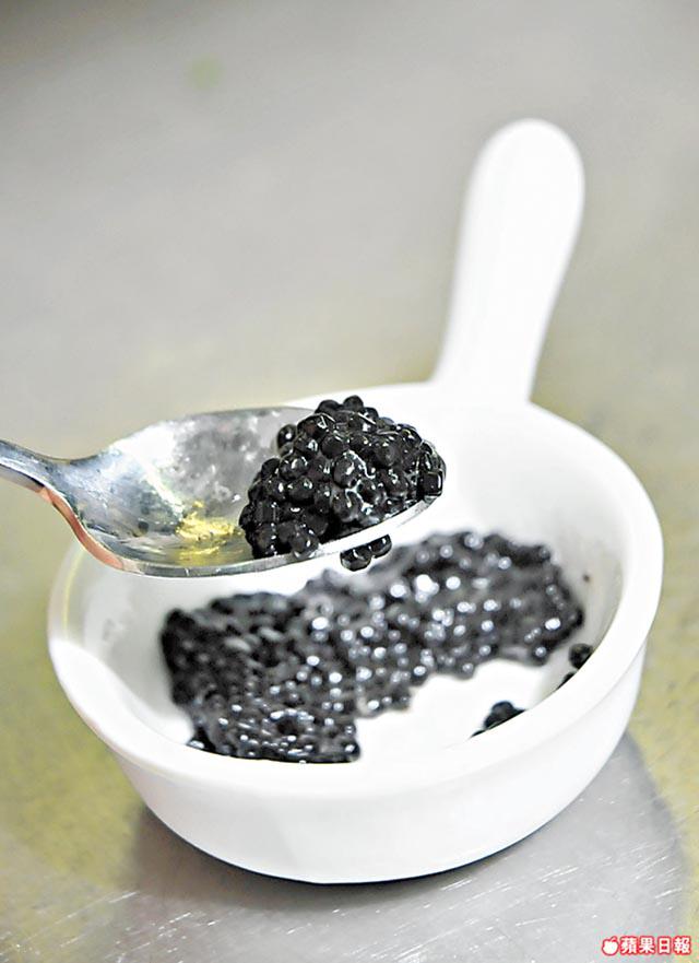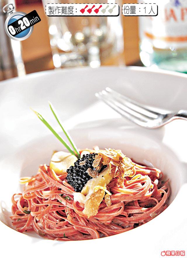 黑松露扁麪110克、牛肝菌(切粒)/番荽碎各20克、Mascarpone芝士10克、分子料理松露魚子醬5克、蒜頭4粒、雞湯40毫升、牛油5克、鹽/黑胡椒/初榨橄欖油各適量、白酒20毫升
