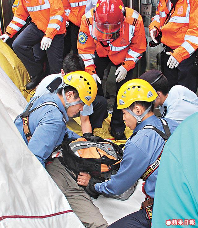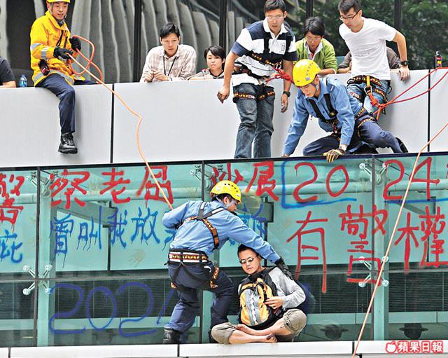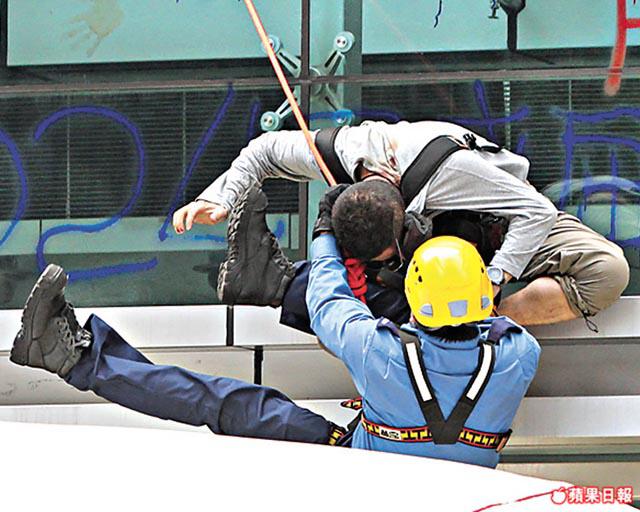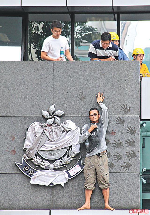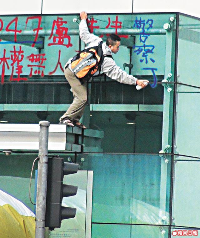 【本報訊】對於請願人士有如銅牆鐵壁的灣仔警察總部,輕易遭「黑超漢」攻陷6小時!36歲工程公司東主,三年前駕貨車至灣仔途中,因不滿密斗貨車切線發生爭執,驚動警員到場。他因情緒激動,被控阻差辦公,罪成罰款9000元。他不滿被「老屈」,多次投訴無果,昨攀上灣仔警察總部大門簷篷,噴漆寫大字、塗污警徽,更以漆罐自扑及利剪架頸與警對峙,最終被消防飛將軍制服送院。