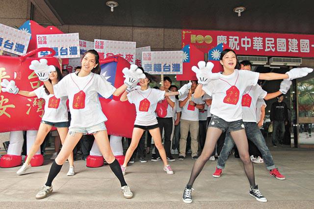 馬英九、吳敦義昨穿上「台灣平安福」T恤,在近200名年輕義工、兩個高1.8米的平安福公仔陪同下前往中選會登記參選,馬表示將努力讓台灣更安全、社會更安定、人民更安心,打造黃金十年願景。