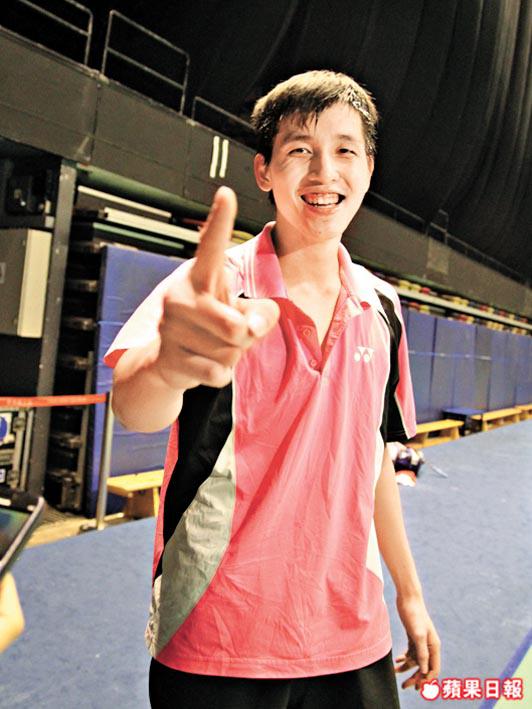 香港有「林丹殺手」稱號的黃永棋(圖),是決賽周首圈比賽最後一個上場的球手,時間是接近凌晨的12時45分,他打足3局終於復仇成功戰勝日本宿敵上田拓馬,那時是凌晨一時多,所以豎起1字手勢以示紀念。