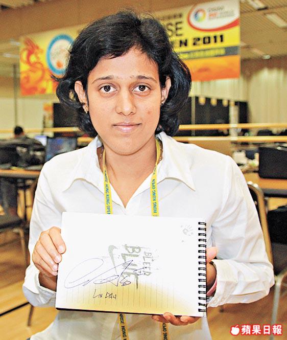 香港今站比賽來了一位印度電視台女記者RugutaLuktuke(圖),原來她是為林丹自費來港,她說最鍾意林丹的cool樣子,但電視台無budget,於是自費來,她說拿到林丹的簽名已值回票價。